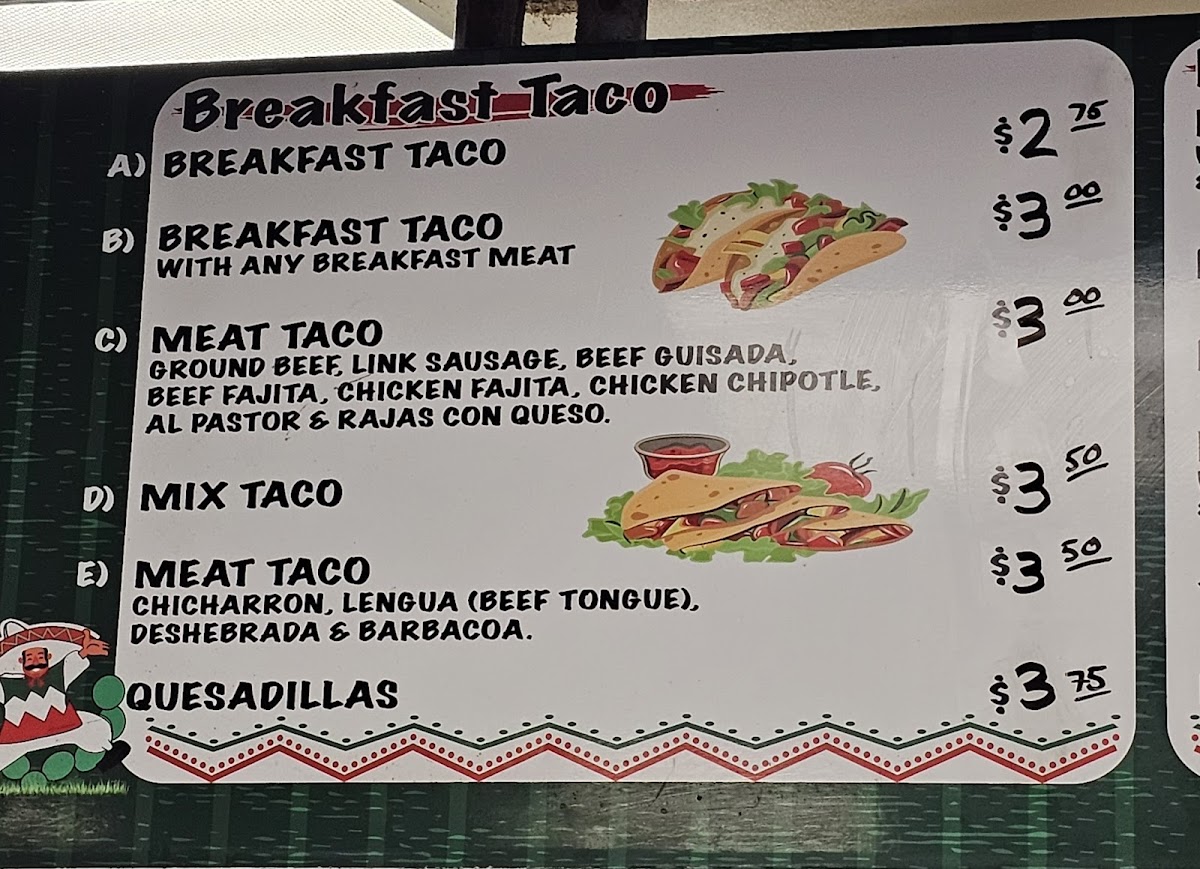 Went with my friend and LOVED IT!!! Realized after most of the food was eaten that I forgot to take a picture for this review. She got two breakfast tacos (pictured) and three regular tacos (beef and chicken, not pictured). All were amazing and my beef tacos were stellar! I loved the little to go salsas at the checkout, spicy and flavorful! Can’t wait to come back
