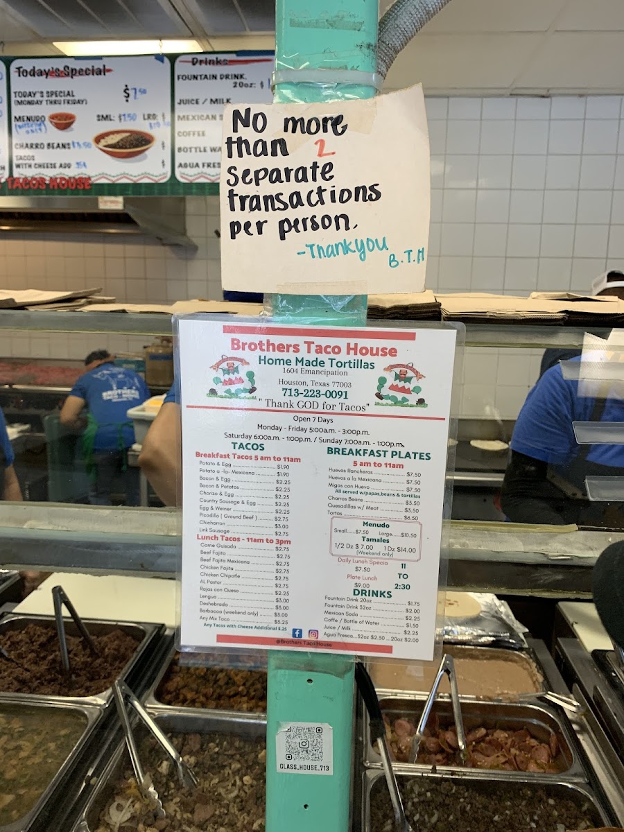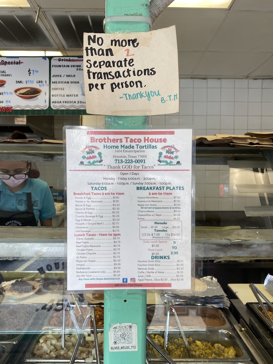 Food is always awesome, love the fact ypur able to mix and match to make the perfect taco, my belly appreciates that lol! The brothers house staff are always friendly and awesome! Their lemonade is delicious. We never eat inside so don't take my 4 stars as much of a hit or the long line to mean much. Just means that the food stays fresh and come with conversation, come hungry